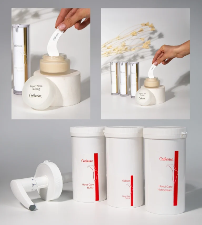 Професійний крем для рук зазвичай не чим не відрізняється окрім об’єму. Так і в філософії компанії Catherine, домашній догляд, це продовження професійного салонного догляду. Всі крема для рук представленні в об’ємі для домашнього догляду і є професійний крем для рук з дозатором 500 мл в одному об’ємі тільки чоловічий крем для рук